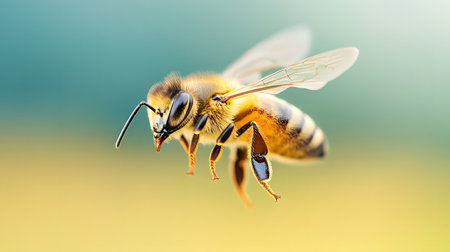 A detailed macro photograph captures a honey bee in midflight against a soft, blurred background. The intricate textures of its wings and body are clearly visible.