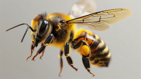 A honey bee is depicted in vivid detail, concentrating on its vibrant yellow and black striped body and delicate wings, highlighting its role in pollination within natural ecosystems.