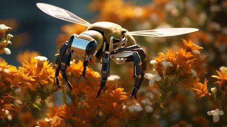 Drones designed as bees hover over flowering plants in a lush green field. Warm sunset light creates an innovative atmosphere for agriculture. Concept of pollination, technology, sustainability.