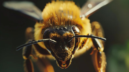 This stunning macro image captures a honey bee in mid-flight, showcasing its detailed features and vibrant colors against a dark background, highlighting the importance of pollinators in the ecosystem.