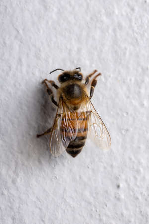 This macro photograph showcases a honey bee in stunning detail, highlighting its intricate wings, antennae, and body structure. Perfect for nature enthusiasts.