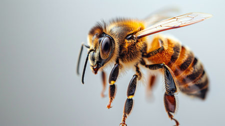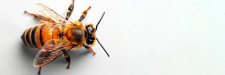 Isolated bee close-up with detailed wings and fur. High-resolution insect against a white backdrop. Concept of bee anatomy, wildlife, and educational content. Banner. Copy space