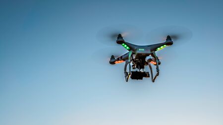 Drone flying with a digital camera and blue sky background. Modern new technology. Drone flying overhead takes aerials professional photos and video