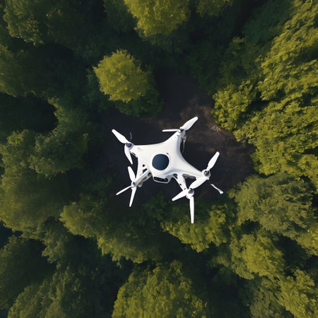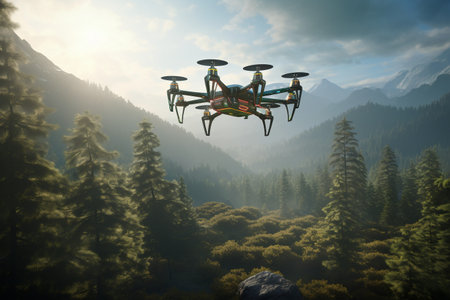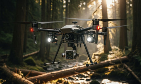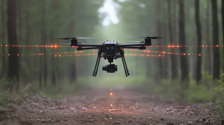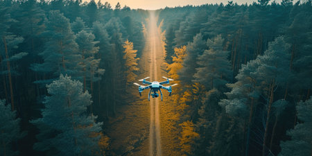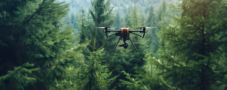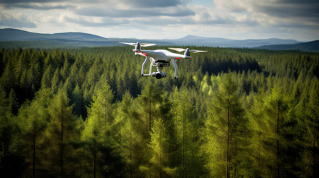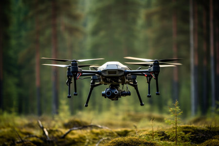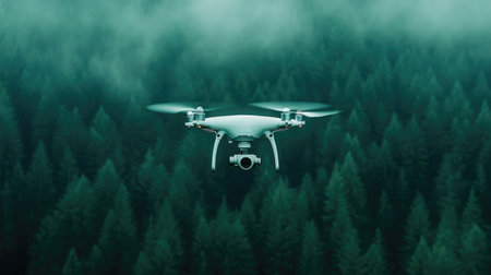 Medium shot of an autonomous drone surveillance patrol flying over a dense forest showcasing advanced technology and remote monitoring capabilities.