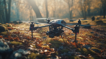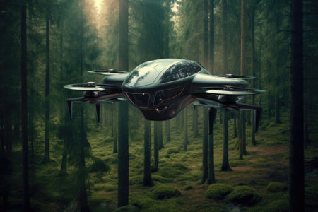 Futuristic drone flies into the forest among the trees. Generative AI illustration