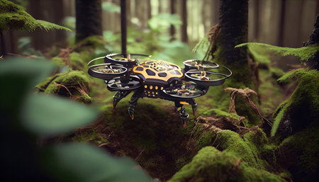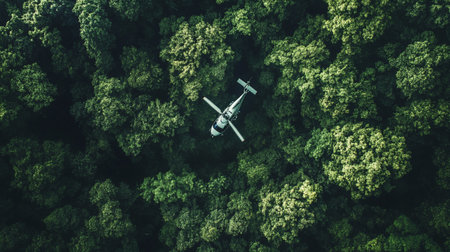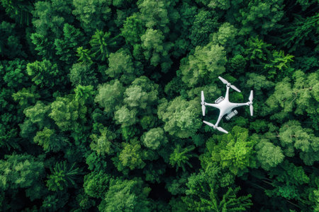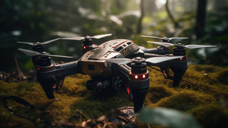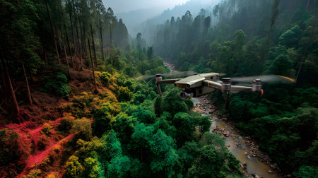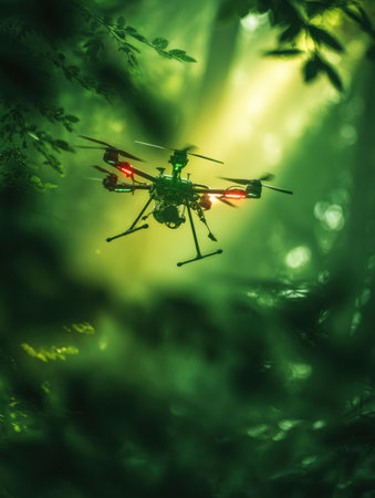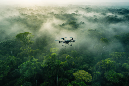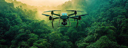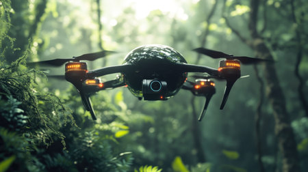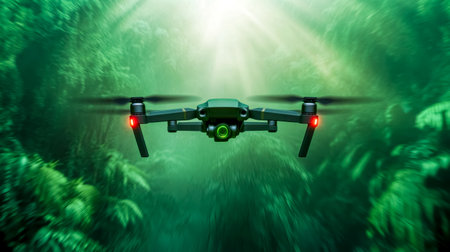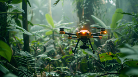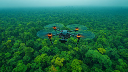 High-tech drone flying over dense rainforest canopy, using sensors for tracking environmental changes and aiding biodiversity conservation efforts.
