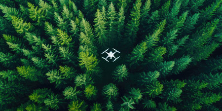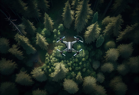 drone flying above forest canopy, with clear view of the trees, created with generative ai