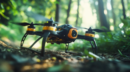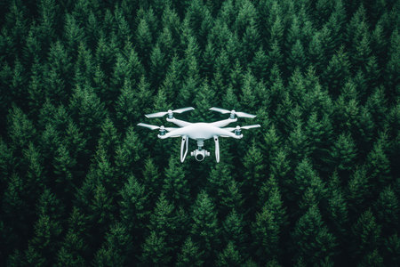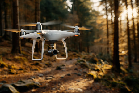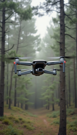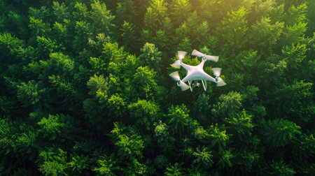 A sleek drone hovers in mid-air above a vibrant forest, capturing breathtaking aerial views. The blurred trees create a tranquil atmosphere and mood.
