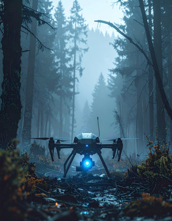 A high-tech drone with a glowing blue light stands ready in the heart of a dark, misty forest.