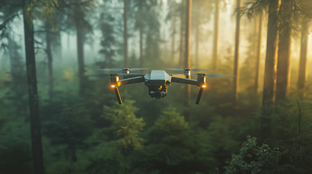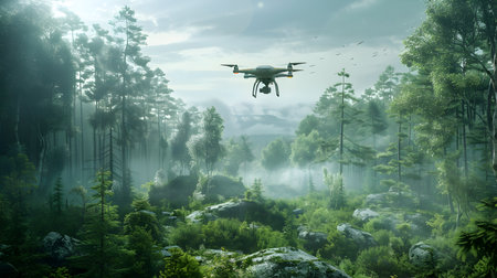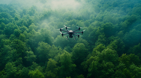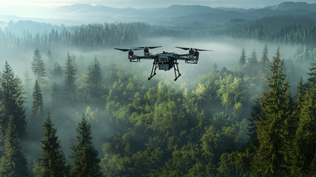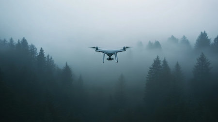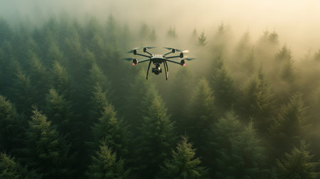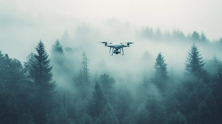 An unmanned aerial drone equipped with sensors hovers in a dense, misty forest, serving as a tool for ecological monitoring and research.