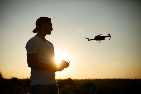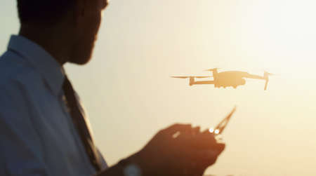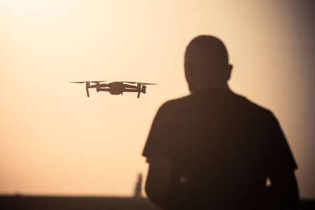 Silhouette of a man piloting drone in the air with a remote controller in his hands on sunset. Pilot takes aerial photos and videos with quadcopter from above