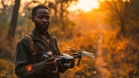 Young african american man with quadcopter drone in the jungle.