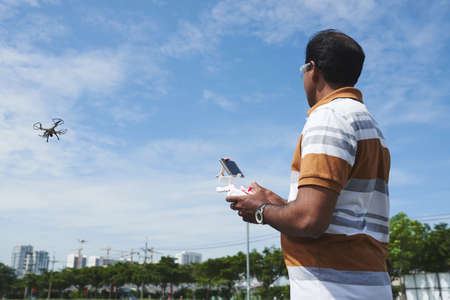 Man pilot controlling quadcopter drone with remote controller pad.