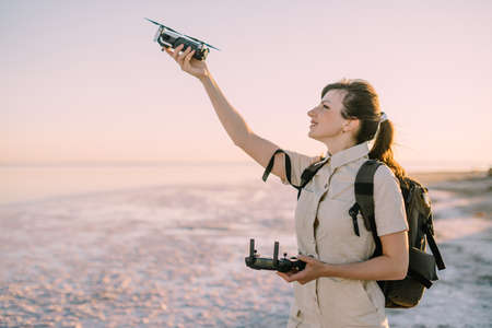 Quadcopter launch. Young woman tourist holds a drone in his hand lifting it up.