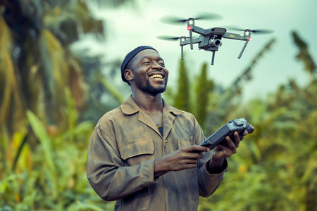 The African American farmer controlling drone and smiling wearing coverall