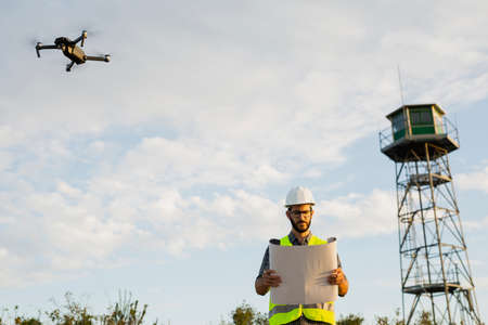 Portrait of a man in a helmet with a drone on a construction site. Generative AI