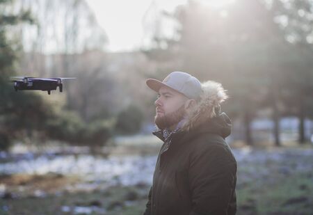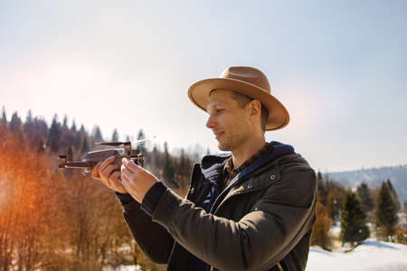 Man hipster controls the flying drones in snowy forest winter. Adventurous winter holiday