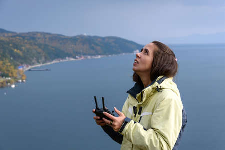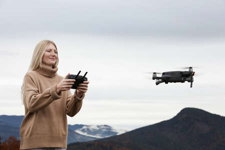 Young woman operating modern drone with remote control in mountains