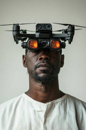 A man stands confidently, wearing a drone headset with bright lights. His expression reflects engagement with advanced technology in a stylish indoor environment.
