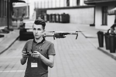 May 25, 2019 Minsk Belarus Street festivities in the evening city Young man launches quadrocopter on the street Black and white image