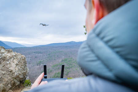 the hands of the male pilot are holding the remote control of the drone. Drone video filming.