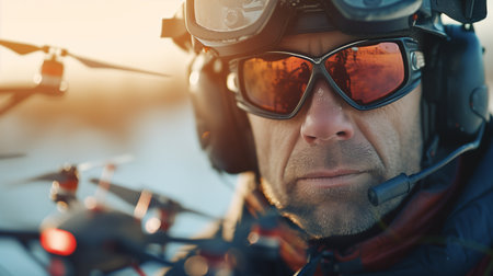 man piloting drone at sunset outdoors