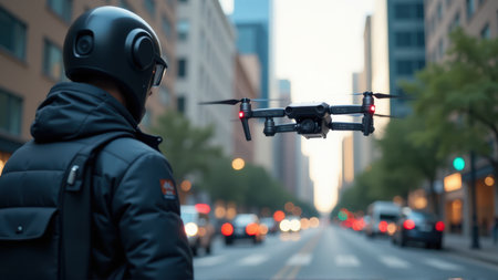 Drone Operator in City, Aerial Photography, Urban Technology, generative Ai