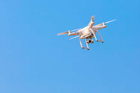 Drone copter flying with digital camera in sky. White quadcopter shoots
