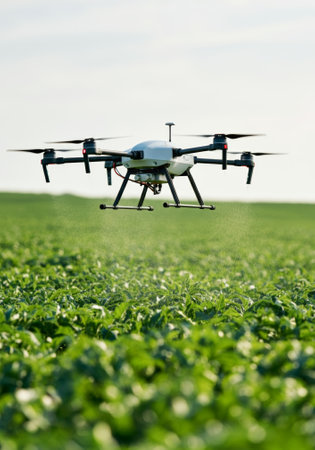 A drone hovers over a greenhouse, collecting vital data from the glass rooftop while surrounded by lush greenery. This innovative technology boosts agricultural efficiency and monitoring.