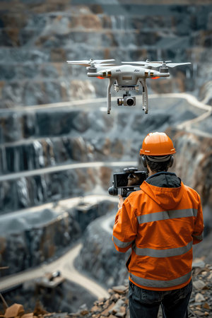 Engineer operates drone amidst Arctic landscape, icy blue surroundings highlighting tech-driven exploration