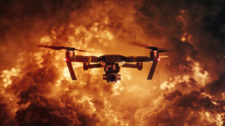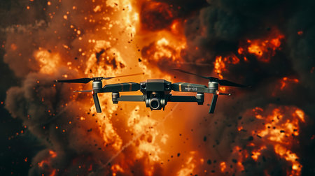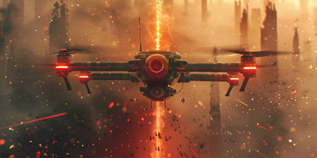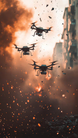 Dramatic scene of aerial drones engaging in combat, targeting enemy forces in warfare