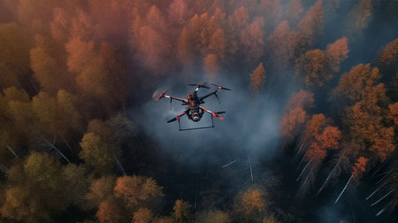 drone flying in the autumn forest. aerial view of drone flying in autumn forest