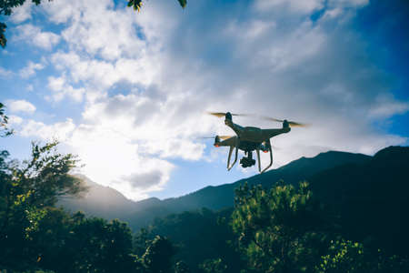 Aerial view of a professional drone with propellers flying with camera and sunset sky in digital technology concept. An electronic gadget equipment. A small plane or aircraft.
