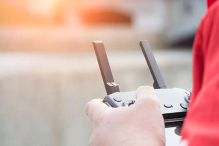 Drone remote control. Remote control in hand man. Man holds remote controller with his hands and controls the drone.