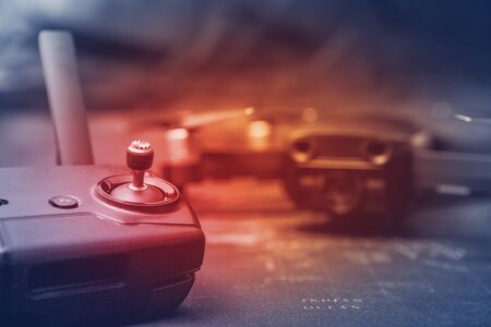 Moody color .The concept of using drones in life and industry. Innovation photography concept. Macro Remote with antennas and a smartphone to control the drone.