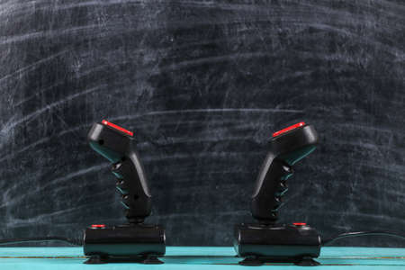 retrogaming. Video game competition. Retro joysticks on blackboard background