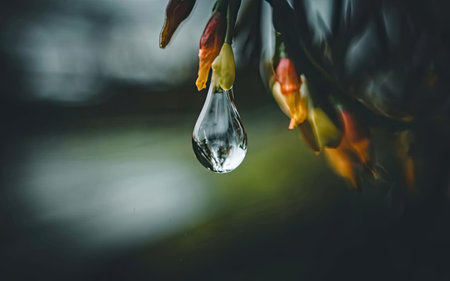 Captivating clarity: A solitary water droplet hanging against a blurred backdrop.