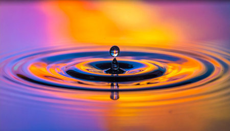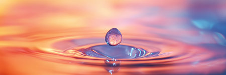 A single water droplet falls into a tranquil surface, sending out waves of ripples through a blend of orange and blue tones, creating a peaceful scene.