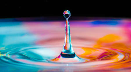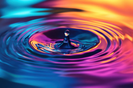 A single water droplet falls into a colorful, reflective liquid surface creating concentric ripples.