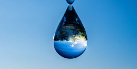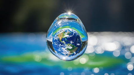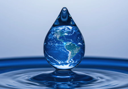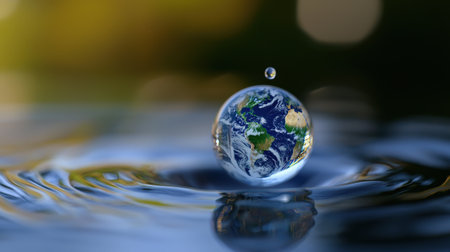 This stunning image captures a water droplet reflecting the planet Earth, symbolizing beauty and the importance of environmental awareness.