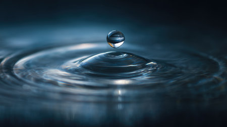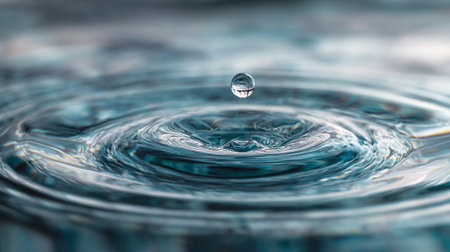 Close-up macro photography of a serene and pristine water droplet impact creating ripples and concentric patterns. Captured in high-speed fluid dynamics