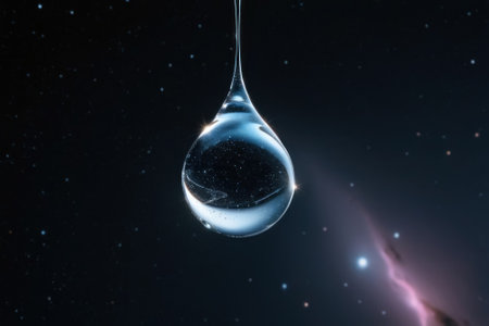 A drop of water with the reflection of stars and galaxies against the backdrop of the universe, creating the impression of infinity and the connection of nature with space.
