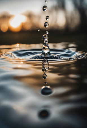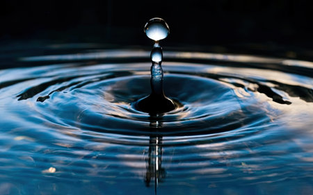 A water droplet impacts a dark blue surface, creating ripples and reflecting light in a serene setting.