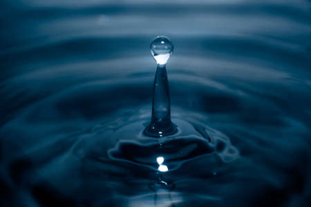 Dark blue water droplets splash close up on the water surface. It creates a water wave and a perfect crown