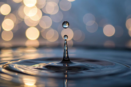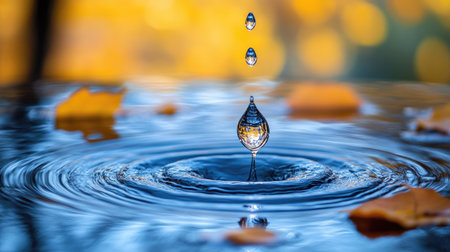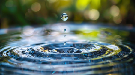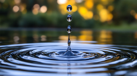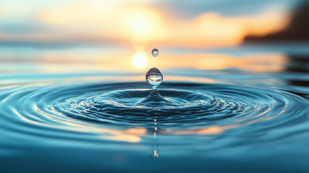 A drop of water falls into a body of water, creating a ripple effect. Concept of calmness and tranquility, as the water droplet gently touches the surface of the water