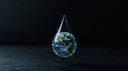 A captivating image of Earth encapsulated within a shimmering water droplet, symbolizing the delicate balance between nature and humanity in a striking dark setting.