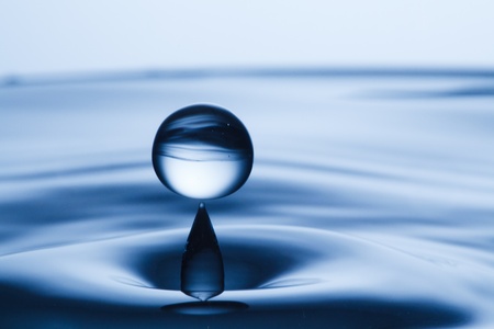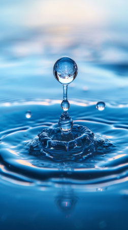 A stunning close-up of a water drop falling and creating ripples on a calm surface. The blue tones and reflections evoke a sense of tranquility and elegance.