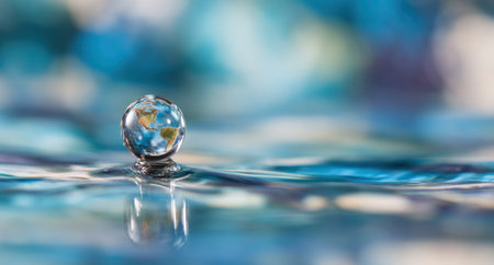 A macro shot features a water droplet reflecting the Earth, atop blurred blue ripples