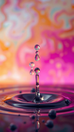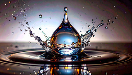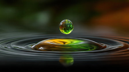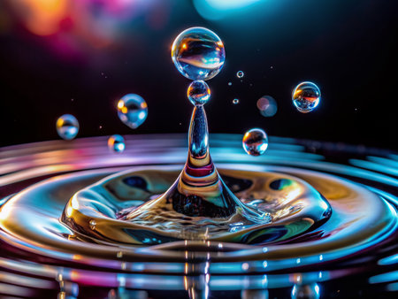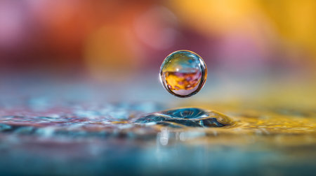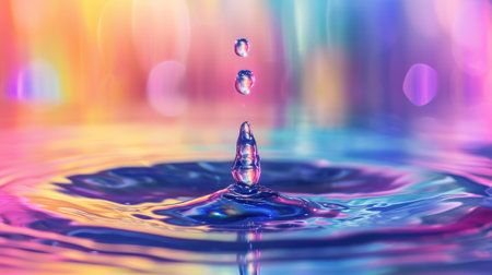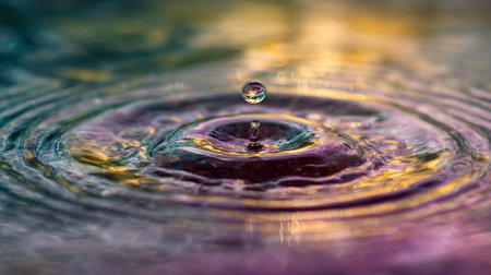 Single water droplet is suspended in mid air, creating a splash and ripples with mesmerizing colors, showing the beauty and power of nature