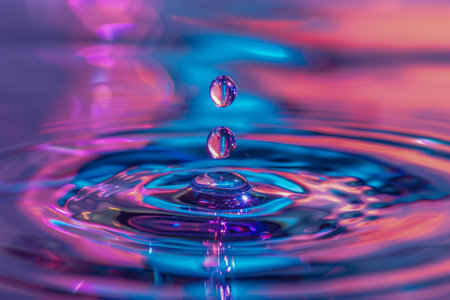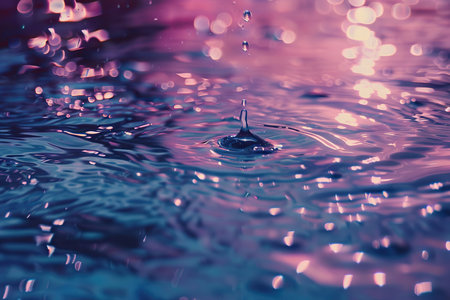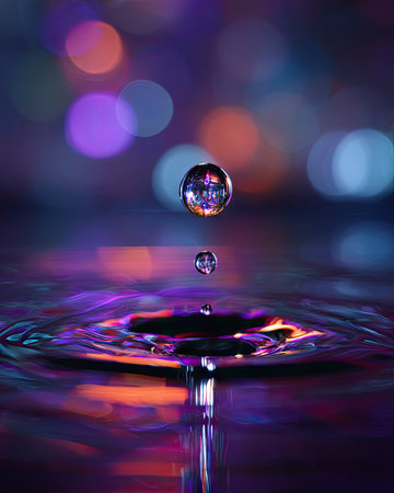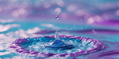 A macro shot captures the precise moment a water droplet impacts a surface, creating intricate ripples and reflections. The image features a vibrant palette of blues, purples, and oranges, with soft bokeh in the background suggesting an outdoor or studio environment. Suitable for artistic projects and commercial applications.